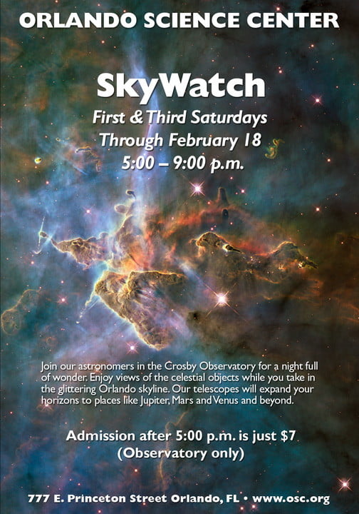 Explore the amazing cosmos during the SkyWatch event at Orlando Science Center. The Crosby Observatory will expand your horizons with views of Jupiter, Mars, Venus and beyond. Admission is just $7 and is a great idea for a cheap family night out in Orlando.