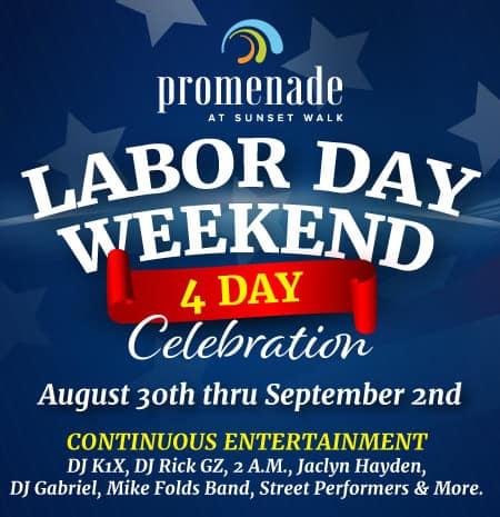 The Promenade Sunset Walk will send summer off with a bang this weekend, with a four-day Labor Day Weekend Celebration that includes music, entertainment, street performers, car shows, an artisan market, food, shopping and more.