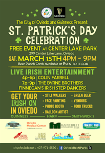 - FREE outdoor festival for all ages. The community of Oviedo is celebrating with Irish entertainment, activities for kids, food trucks, and beer options.