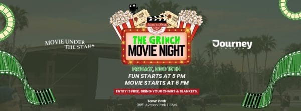 Enjoy a holiday classic under the stars in Town Park at Avalon Park. Bring your own chairs, blankets, and movie treats to enjoy a showing of The Grinch. This FREE event is fun for the whole family!