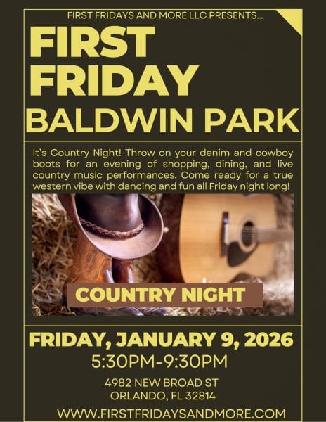 Embrace rustic country vibes for Country Night in Baldwin Park. Don your cowboy boots and cowboy hats to enjoy live country music, line dancing, unique vendors, and more. This FREE family-friendly and pet-friendly event is sure to be a hit.